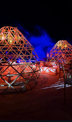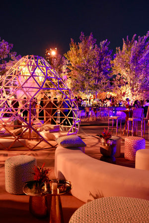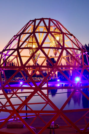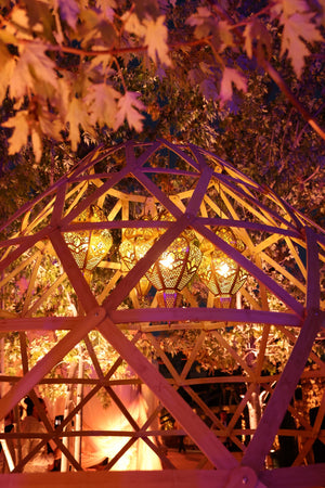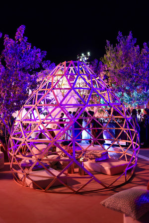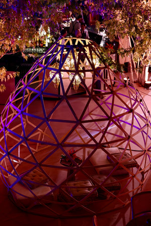 The name ZOME comes from zonohedron + dome. It is a functional yet visually powerful form that can fill a space seamlessly. ZOME is build out of perfectly crafted and finished bamboo elements. Bamboo is high in tensile strength making it perfect for this structure, allowing the strips to slightly bend without breaking.